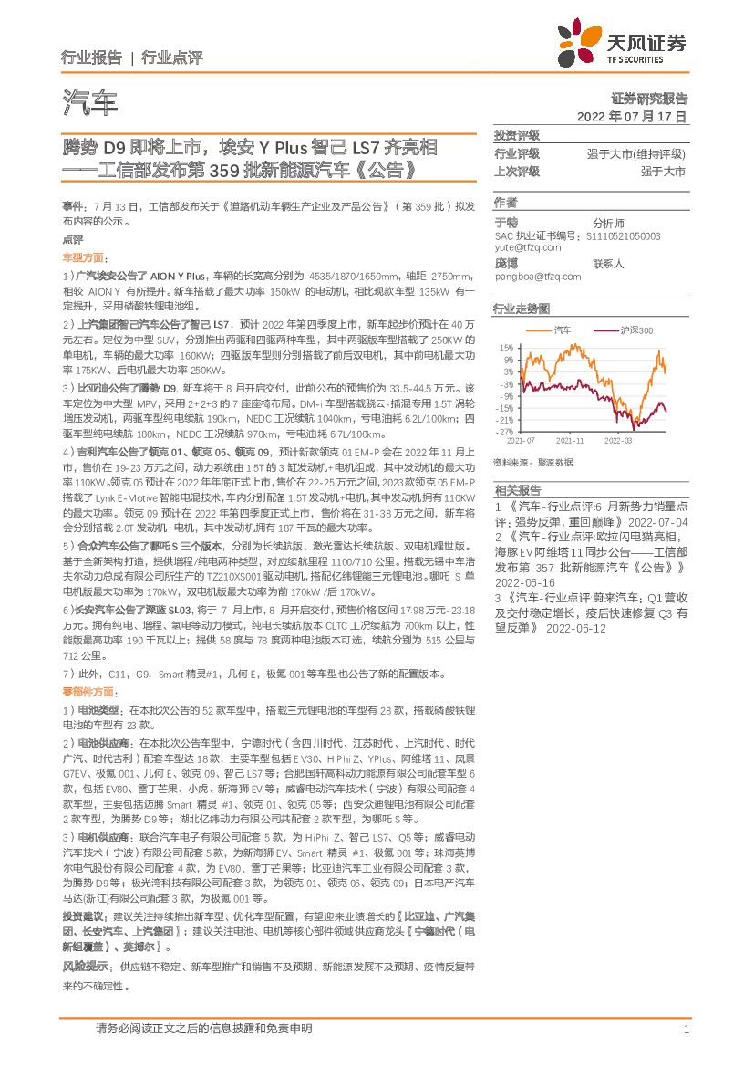 天风证券:汽车:工信部发布第359批新能源汽车《公告》-腾势D9即将上市,埃安YPlus智己LS7齐亮相.pdf