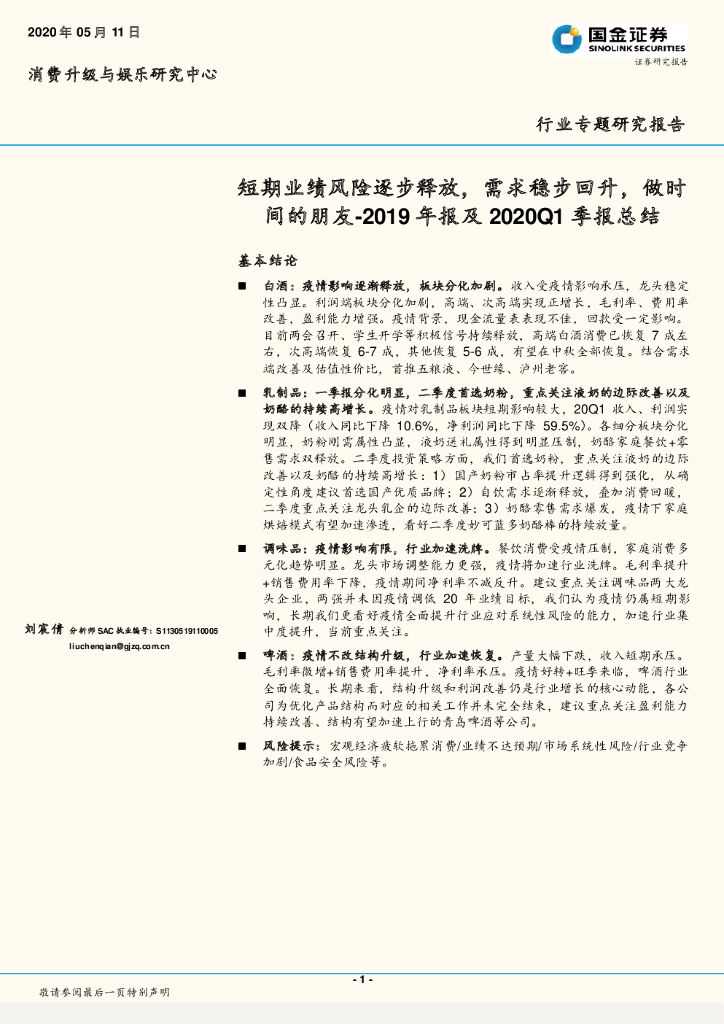 国金证券:食品饮料:短期业绩风险逐步释放,需求稳步回升,做时间的朋友-2019年报及2020Q1季报总结.pdf