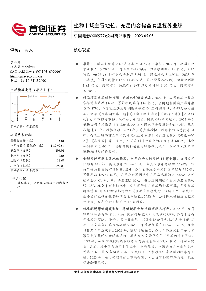 首创证券:中国电影(600977)-公司简评报告:坐稳市场主导地位,充足内容储备有望复苏业绩.pdf