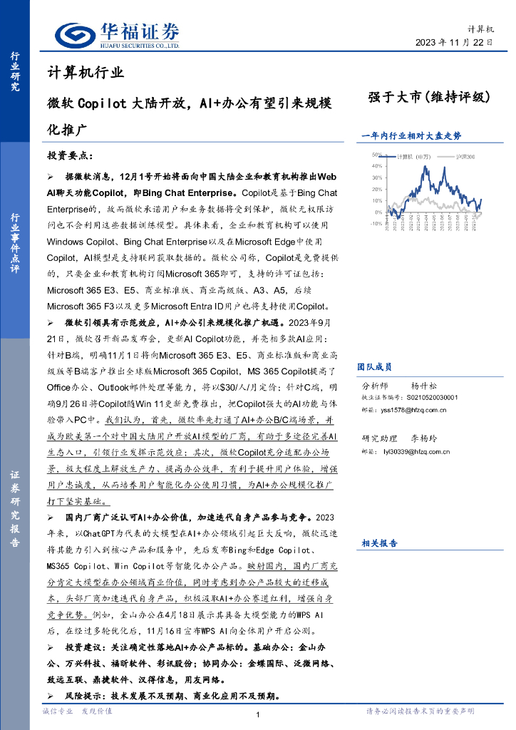 华福证券:计算机行业:微软Copilot大陆开放,AI+办公有望引来规模化推广.pdf