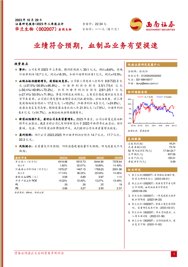 西南证券:华兰生物(002007)-业绩符合预期,血制品业务有望提速.pdf