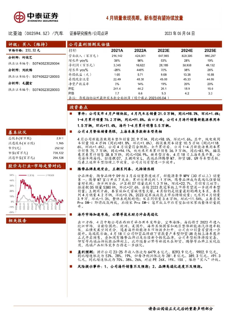 中泰证券:比亚迪(002594)-4月销量表现亮眼,新车型有望持续放量.pdf