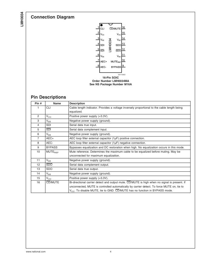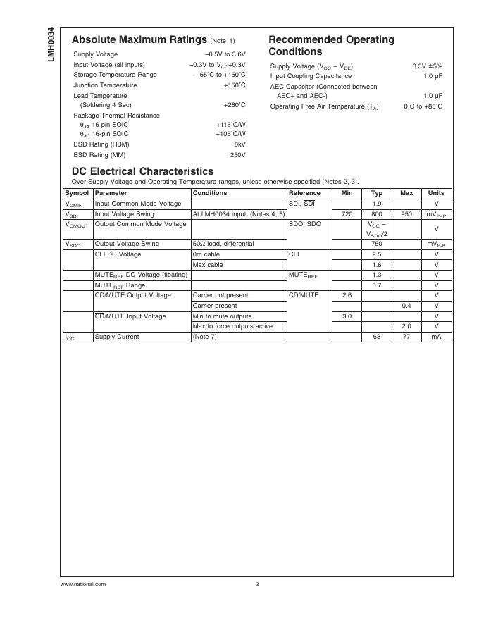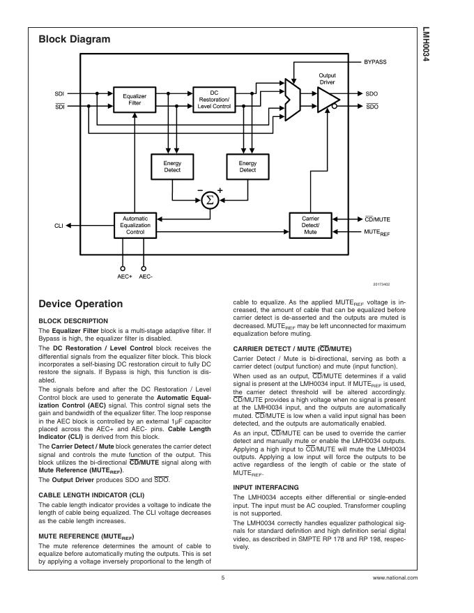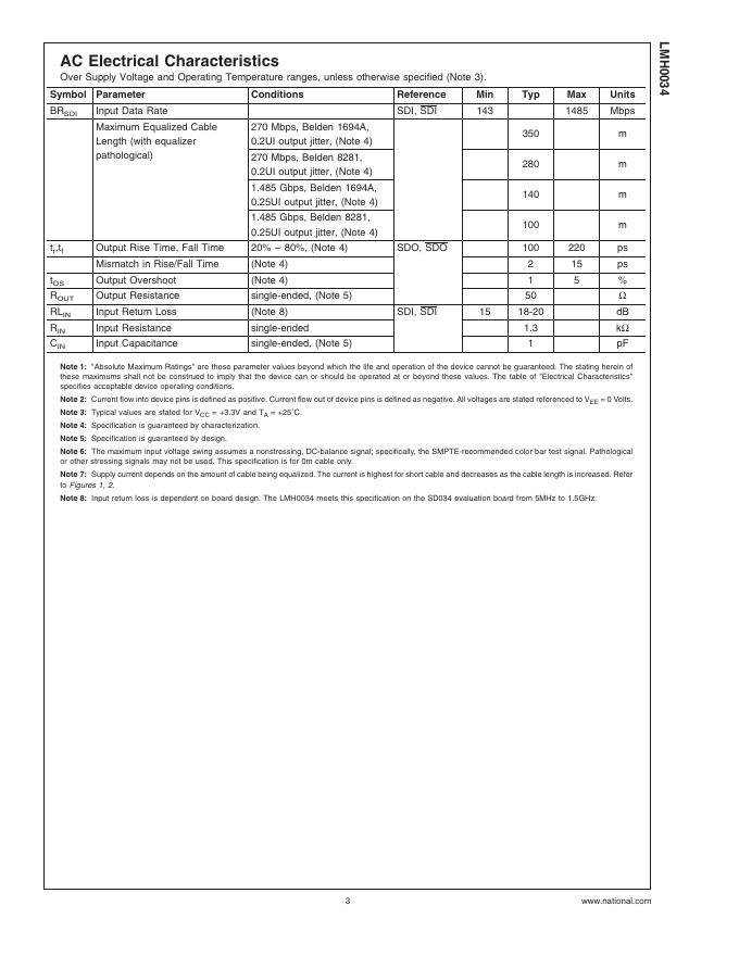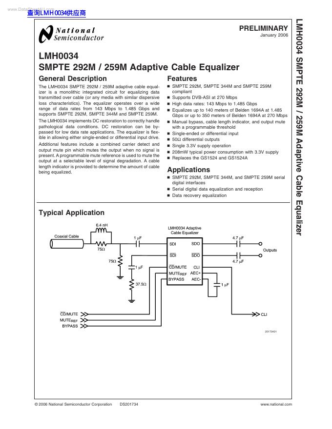 National Semiconductor LMH0034 SMPTE 292M / 259M Adaptive Cable Equalizer 数据手册.pdf