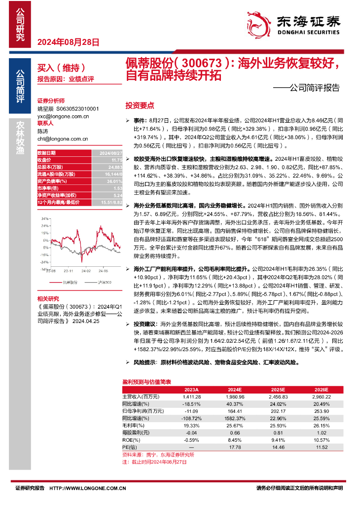 东海证券:佩蒂股份(300673)-公司简评报告:海外业务恢复较好,自有品牌持续开拓.pdf