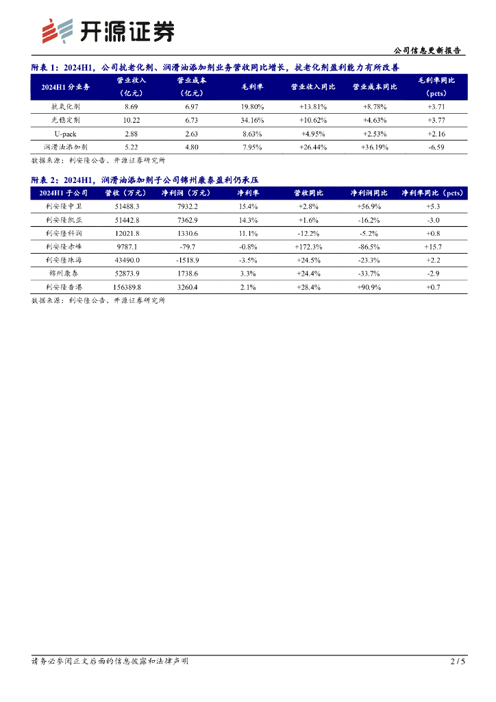 开源证券:利安隆(300596)-公司信息更新报告:Q2业绩符合预期,主营业务营收同比增长、抗老化剂盈利有所改善.pdf