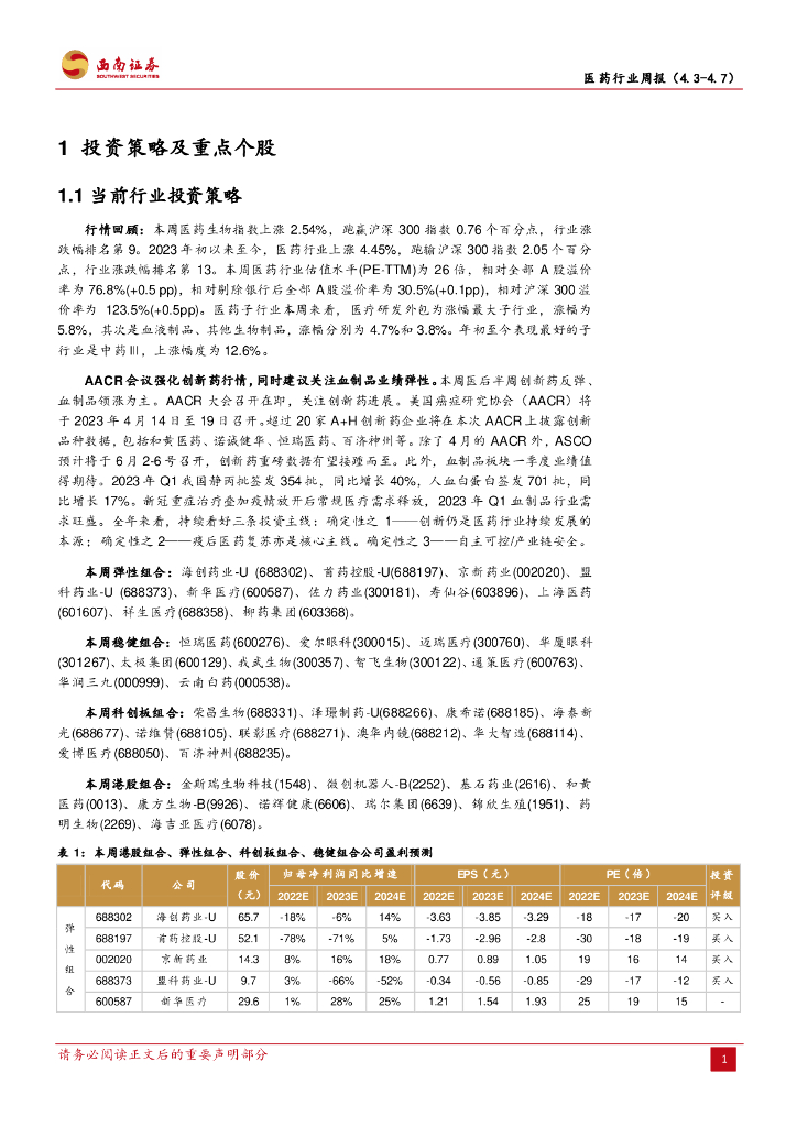 西南证券:医药行业周报:AACR驱动创新药行情,同时关注血制品板块.pdf