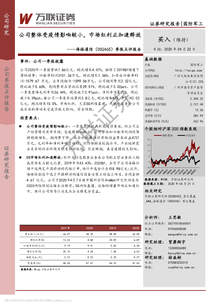 万联证券:海格通信(002465)-季报点评报告:公司整体受疫情影响较小,市场红利正加速释放.pdf