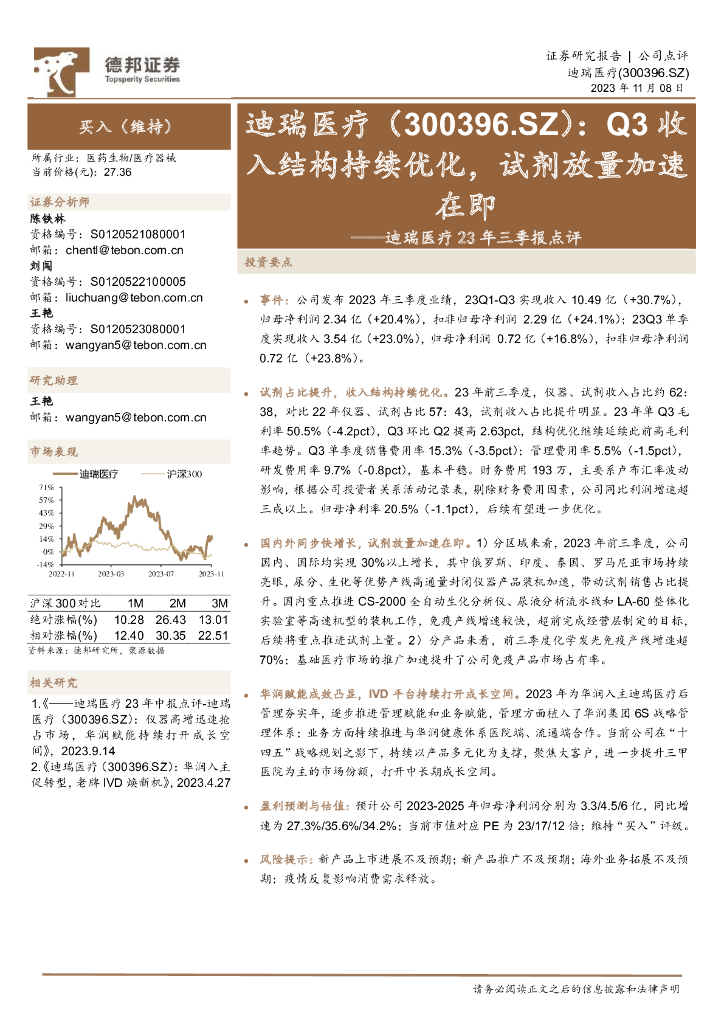 德邦证券:迪瑞医疗(300396)-23年三季报点评:Q3收入结构持续优化,试剂放量加速在即.pdf
