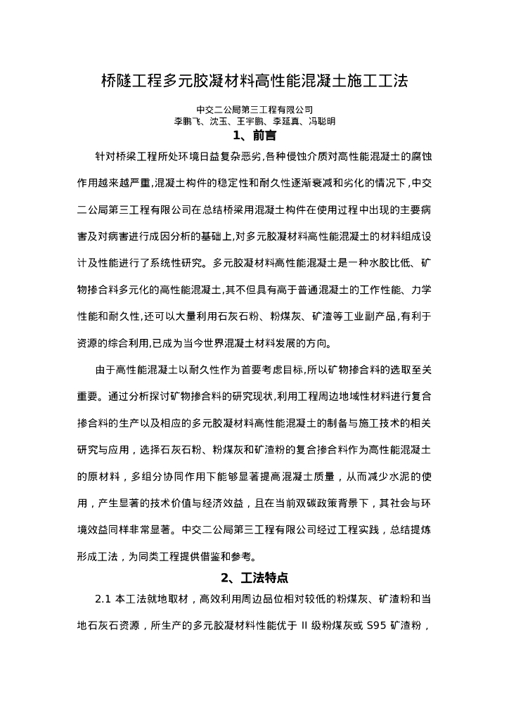 QHGF-2022005 桥隧工程多元胶凝材料高性能混凝土施工工法.doc