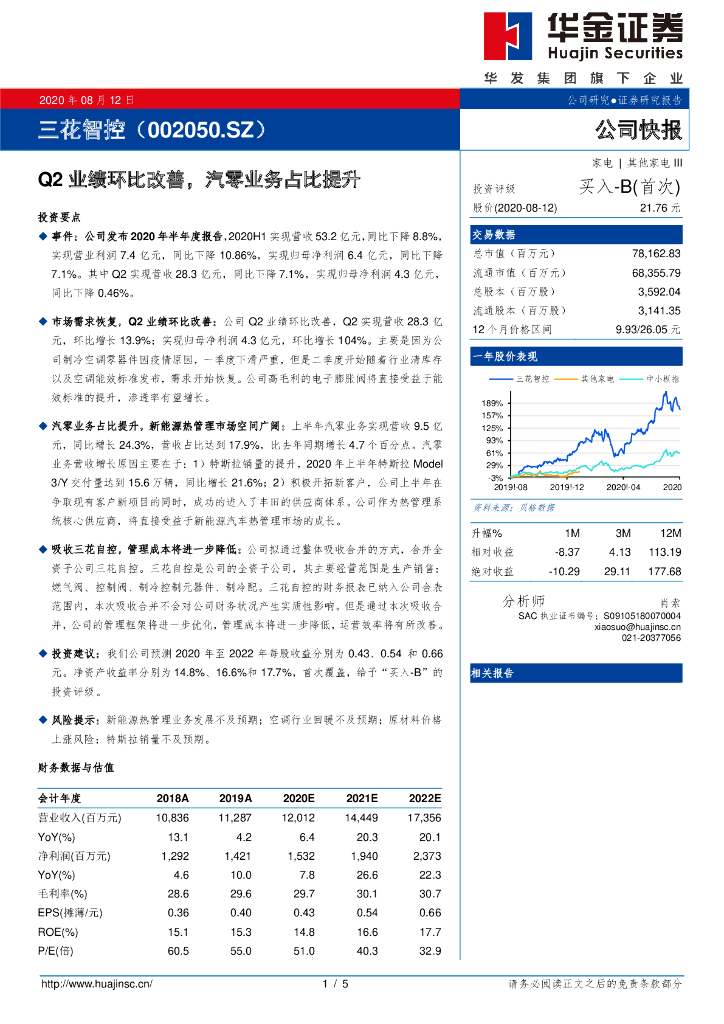 华金证券:三花智控(002050)-Q2业绩环比改善,汽零业务占比提升.pdf