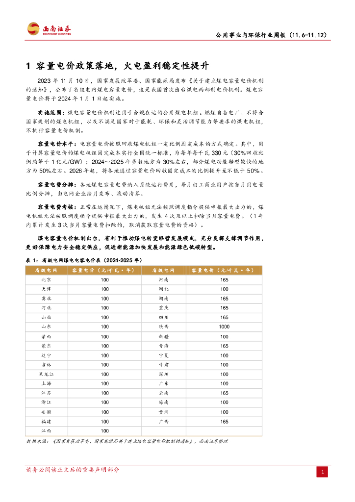 西南证券:公用事业与环保行业周报:容量电价政策落地,火电盈利稳定性提升.pdf