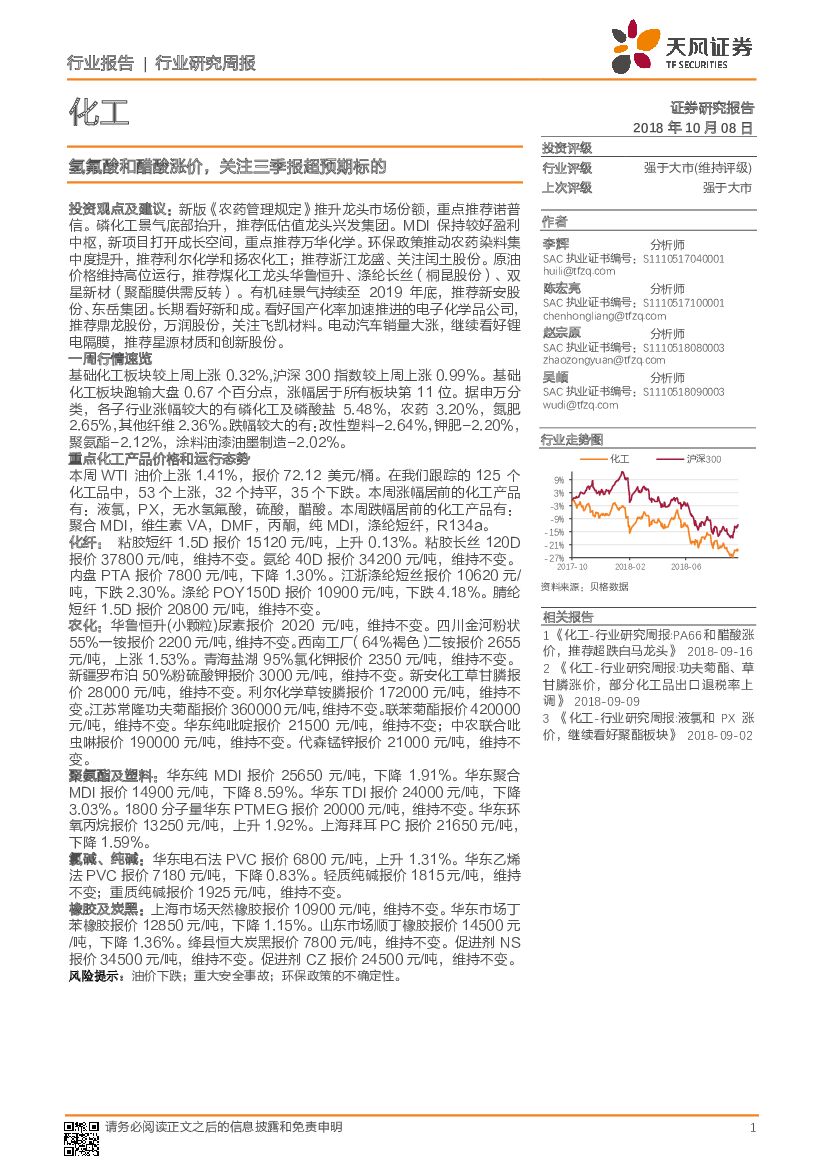 天风证券:化工行业研究周报:氢氟酸和醋酸涨价,关注三季报超预期标的.pdf