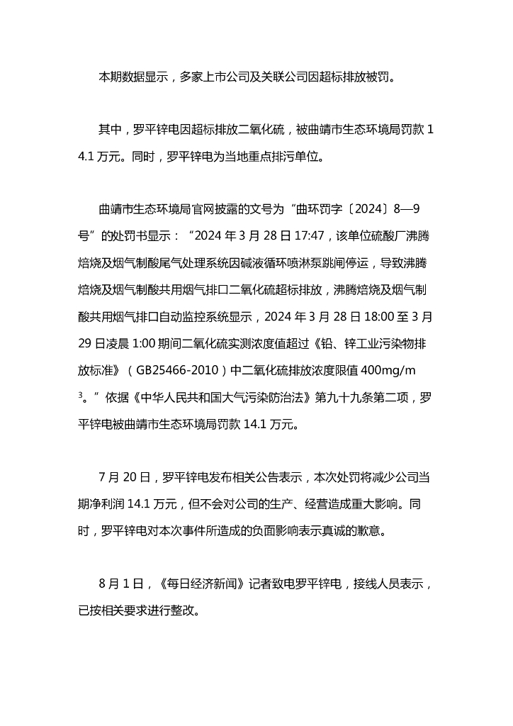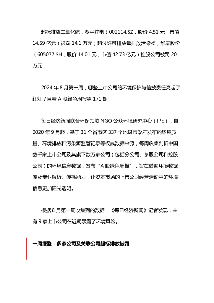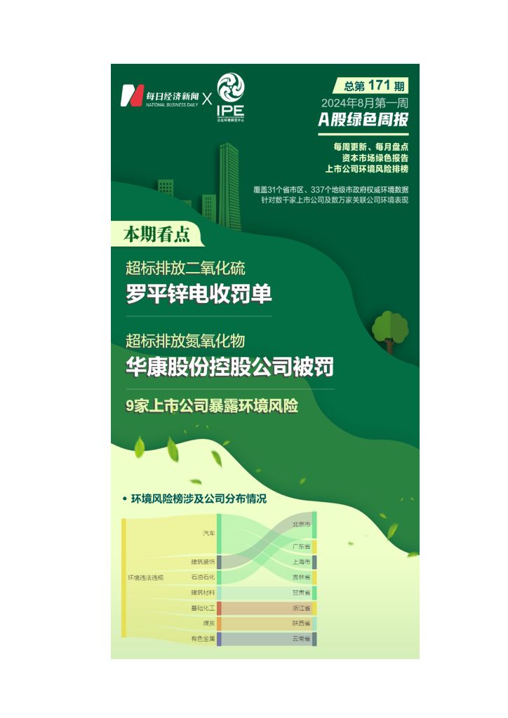 A股绿色周报(2024年8月第一周 总第171期):9家上市公司暴露环境风险 罗平锌电、华康股份控股公司因超标排放收罚单.pdf