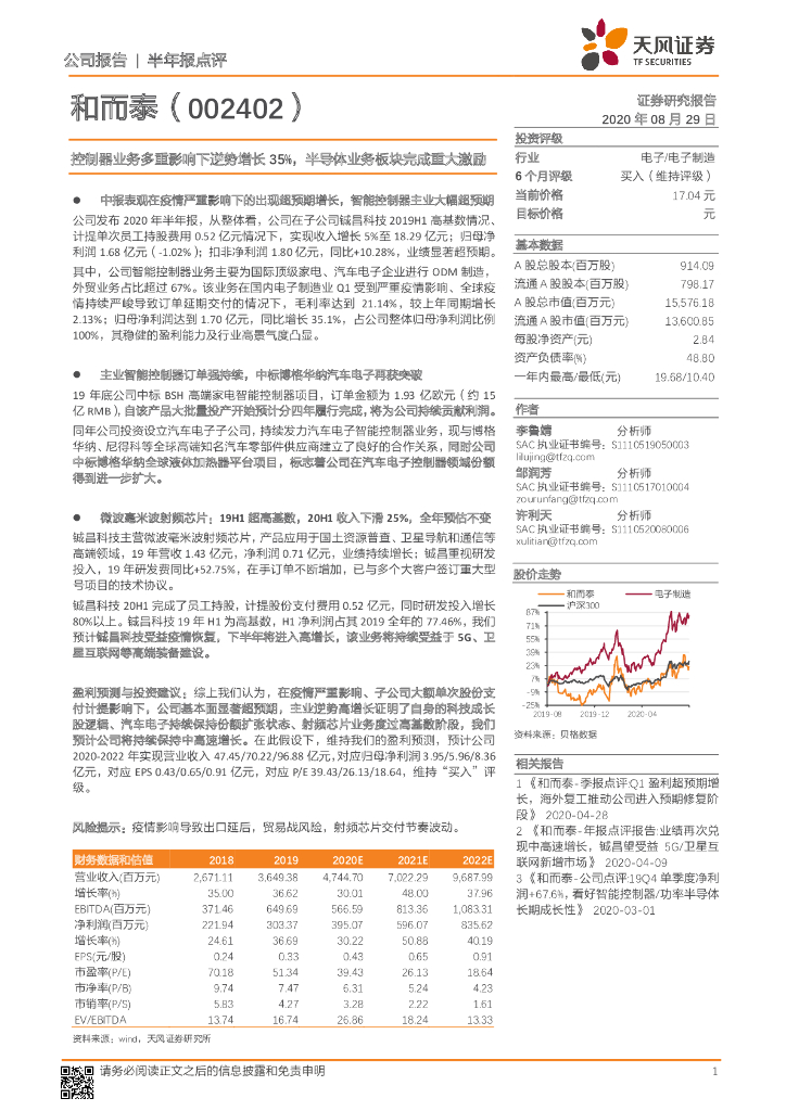天风证券:和而泰(002402)-控制器业务多重影响下逆势增长35%,半导体业务板块完成重大激励.pdf