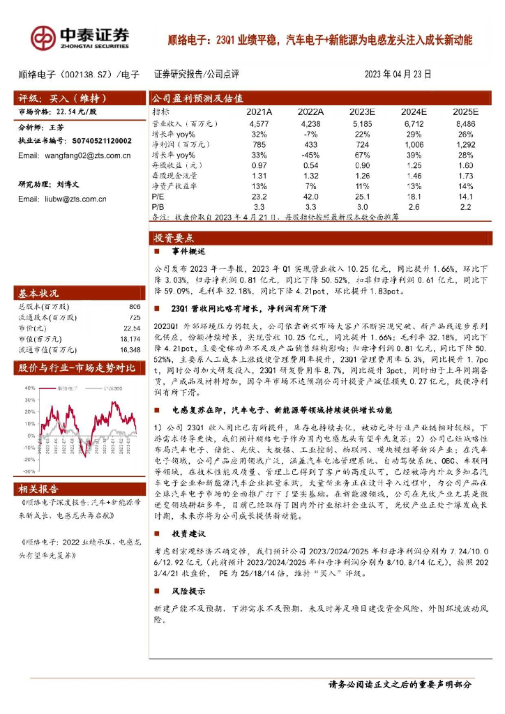 中泰证券:顺络电子:23Q1业绩平稳,汽车电子+新能源为电感龙头注入成长新动能.pdf