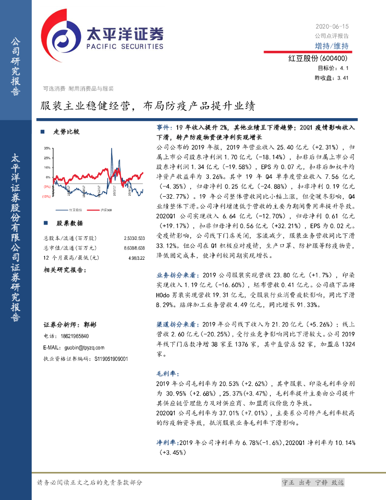 太平洋证券:红豆股份(600400)-服装主业稳健经营,布局防疫产品提升业绩.pdf