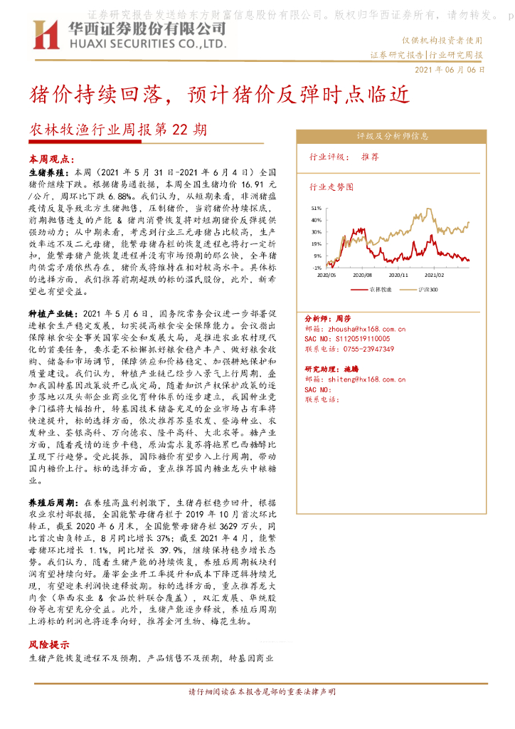 华西证券:农林牧渔行业周报第22期:猪价持续回落,预计猪价反弹时点临近.pdf