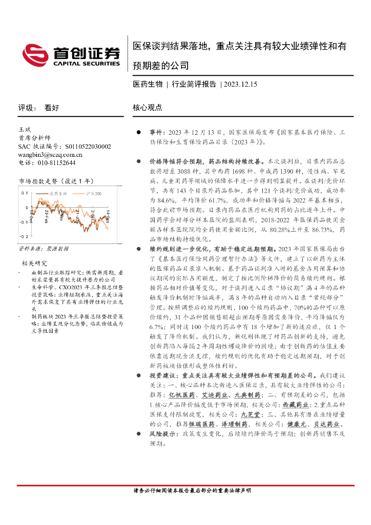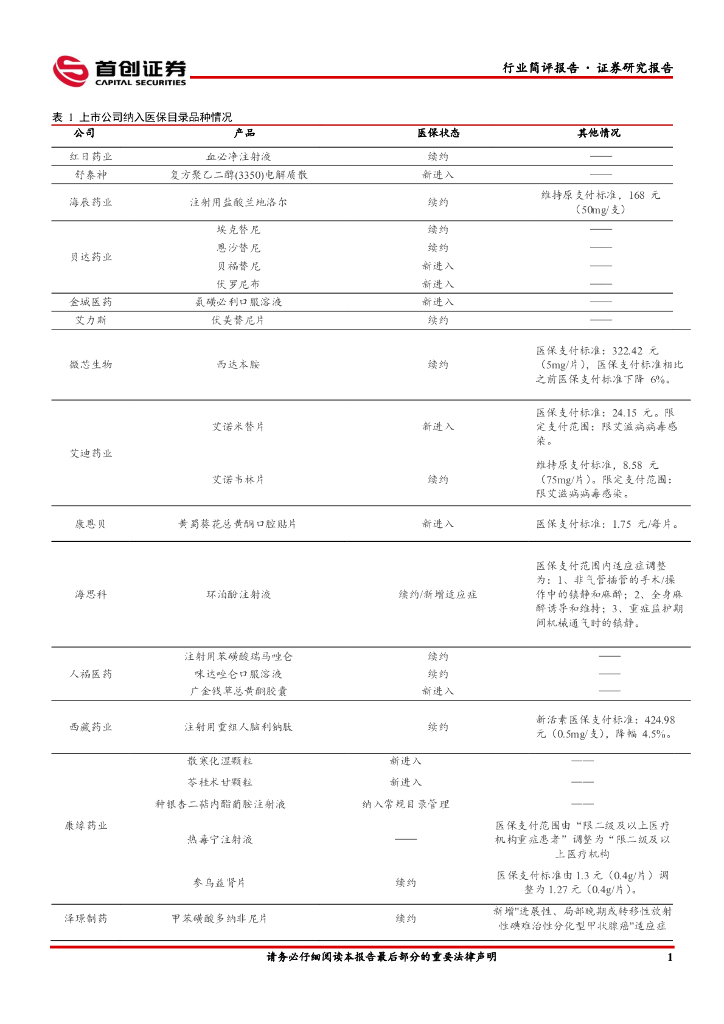 首创证券:医药生物行业简评报告:医保谈判结果落地,重点关注具有较大业绩弹性和有预期差的公司.pdf