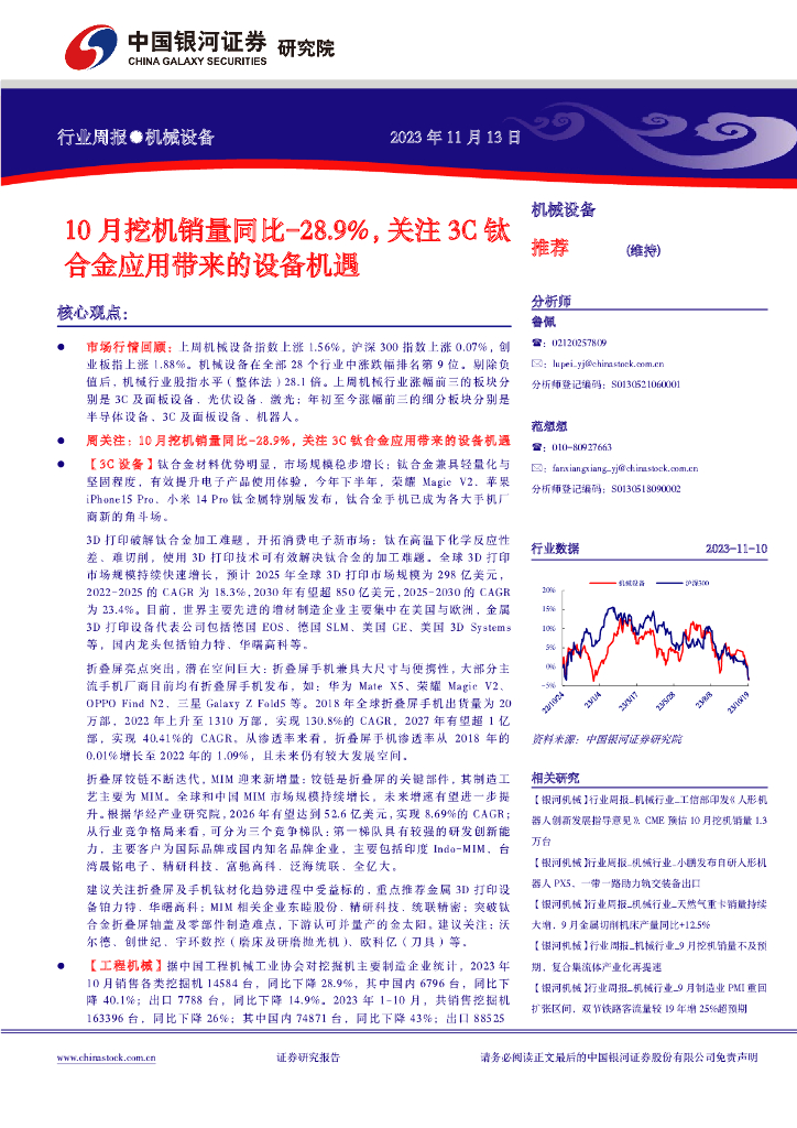 中国银河:机械设备行业周报:10月挖机销量同比-28.9%,关注3C钛合金应用带来的设备机遇.pdf