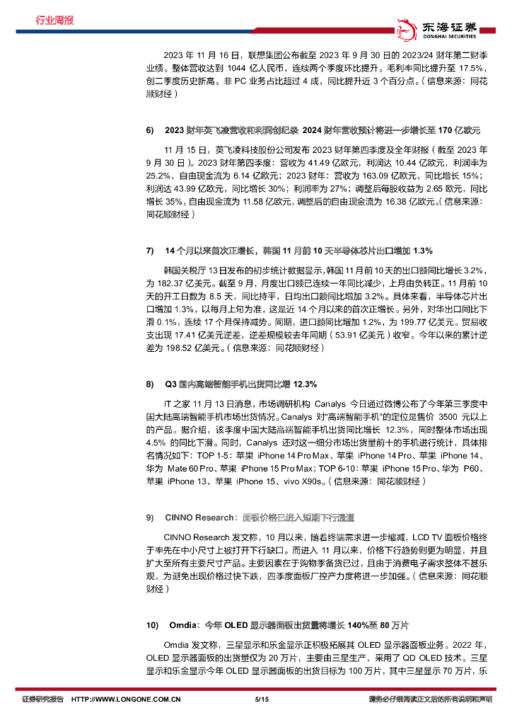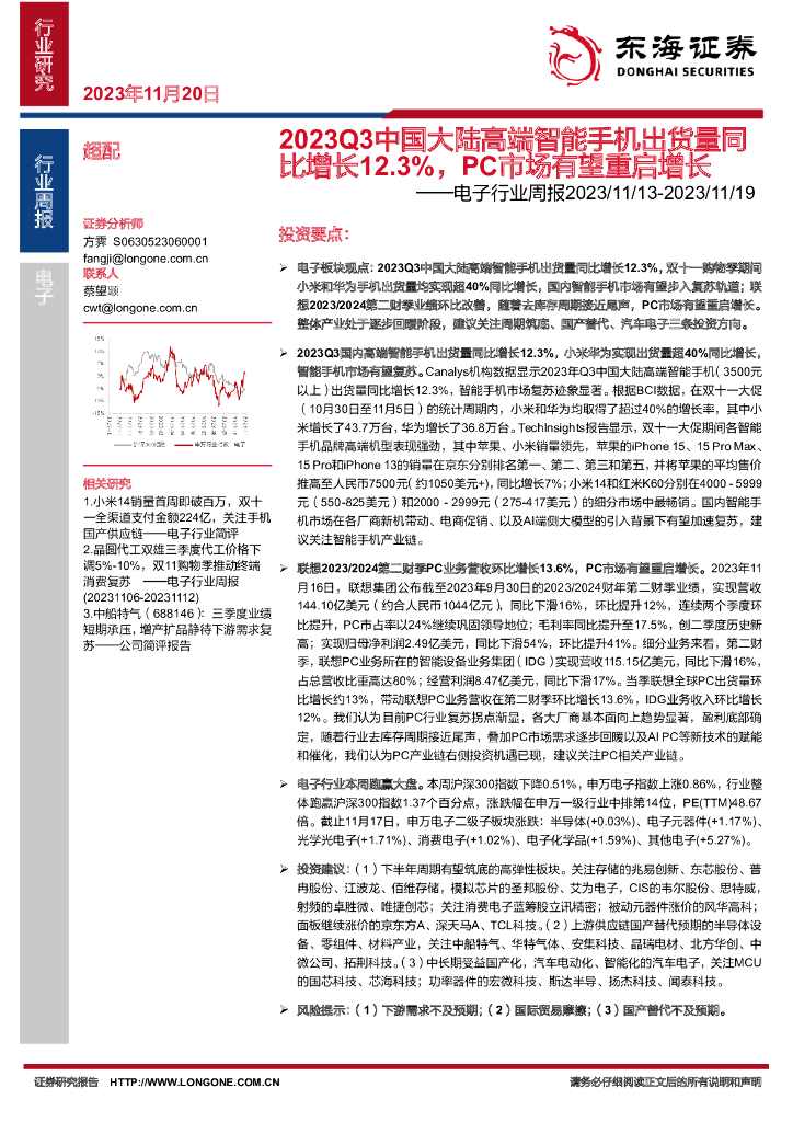 东海证券:电子行业周报:2023Q3中国大陆高端智能手机出货量同比增长12.3%,PC市场有望重启增长.pdf