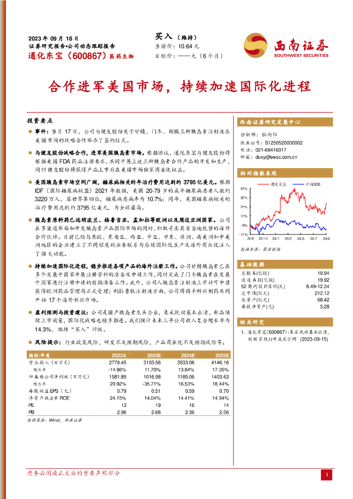 西南证券:通化东宝(600867)-合作进军美国市场,持续加速国际化进程.pdf