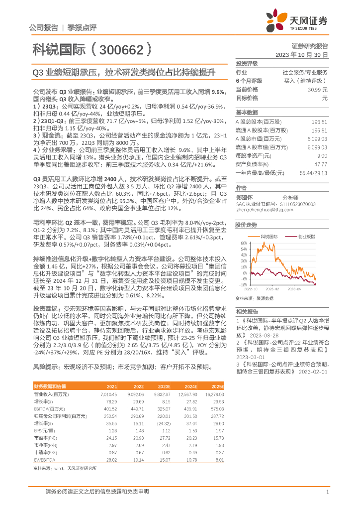 天风证券:科锐国际(300662)-Q3业绩短期承压,技术研发类岗位占比持续提升.pdf