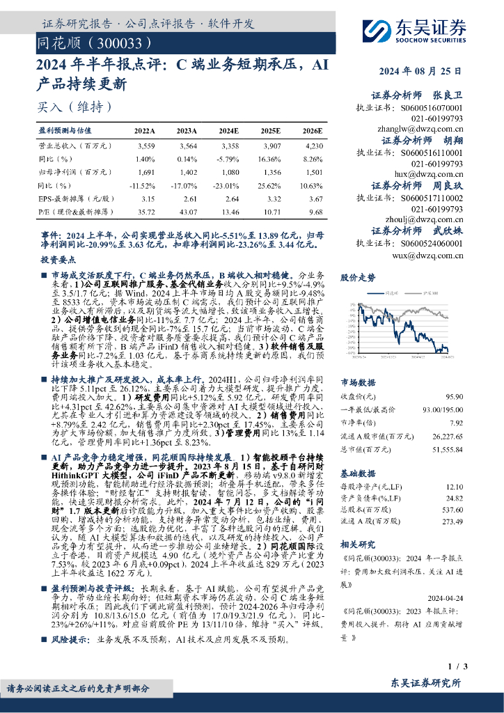东吴证券:同花顺(300033)-2024年半年报点评:C端业务短期承压,AI产品持续更新.pdf