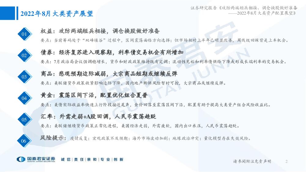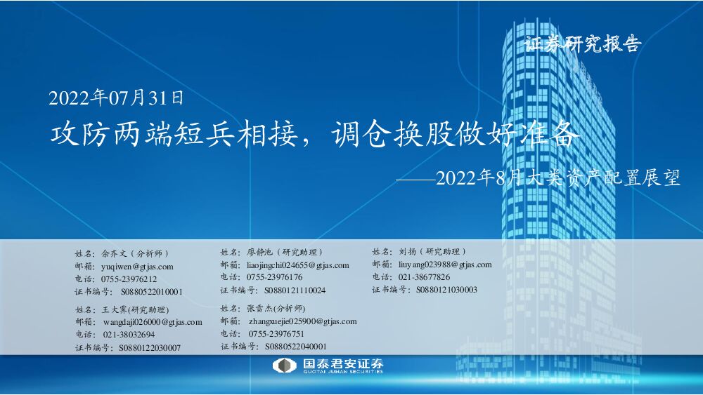 国泰君安:2022年8月大类资产配置展望:攻防两端短兵相接,调仓换股做好准备.pdf