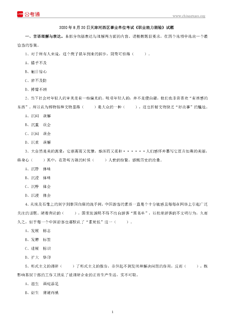 2020年8月20日天津河西区事业单位考试《职业能力测验》试题.pdf