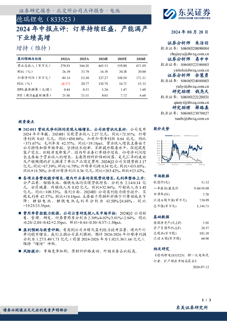 东吴证券:德瑞锂电(833523)-2024年中报点评:订单持续旺盛,产能满产下业绩高增.pdf