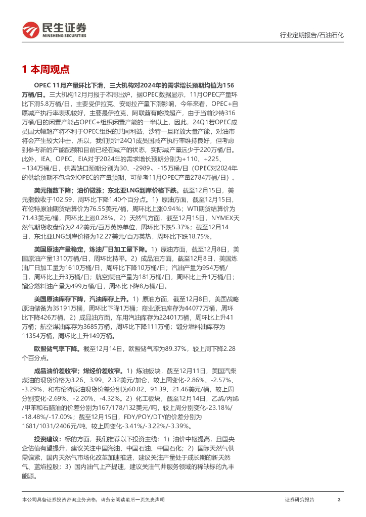 民生证券:石化周报:三大机构对2024年需求增长预期均值为每日156万桶/日.pdf