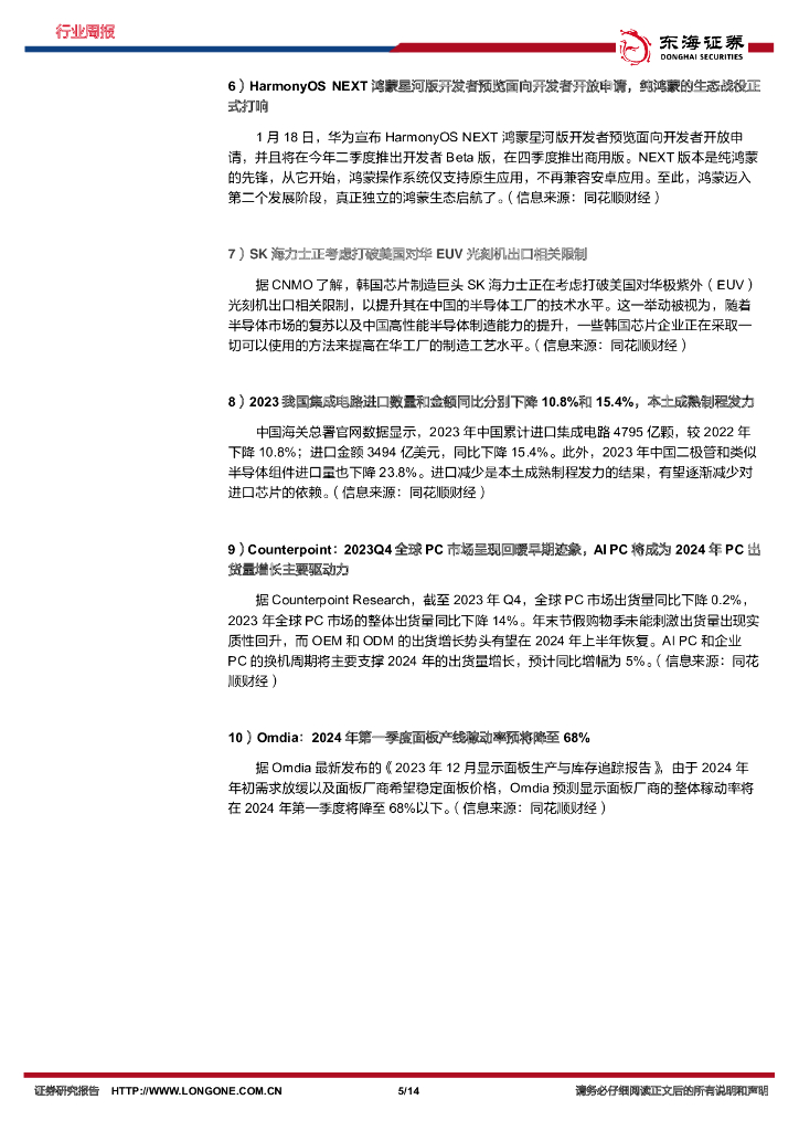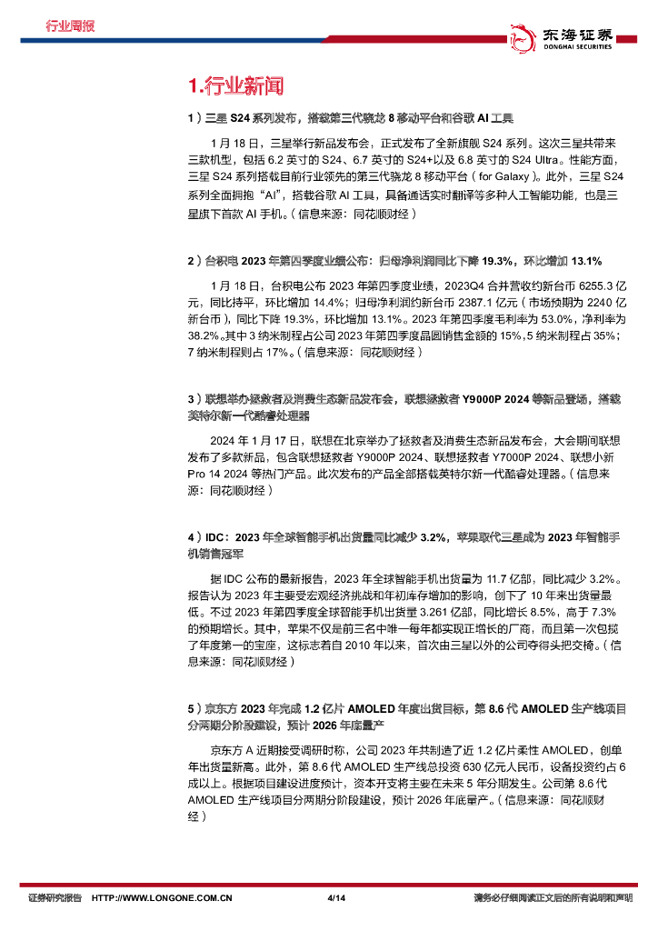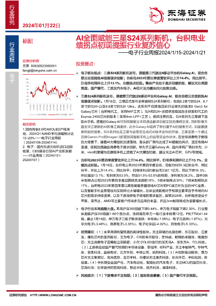 东海证券:电子行业周报:AI全面赋能三星S24系列新机,台积电业绩拐点初现提振行业复苏信心.pdf