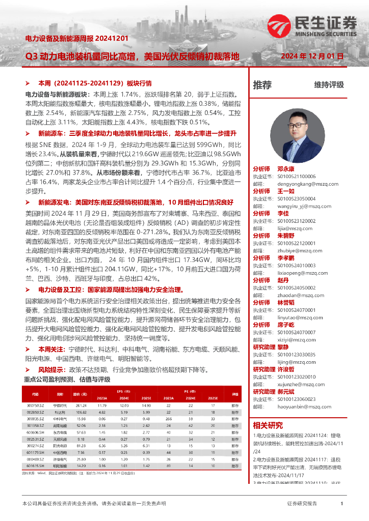 民生证券:电力设备及新能源周报:Q3动力电池装机量同比高增,美国光伏反倾销初裁落地.pdf