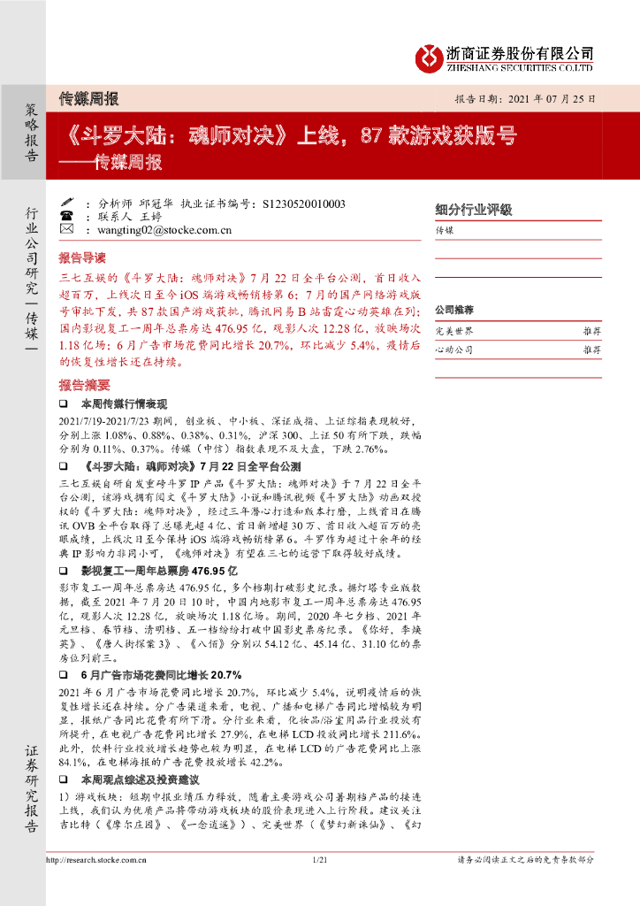 浙商证券:传媒周报:《斗罗大陆:魂师对决》上线,87款游戏获版号.pdf