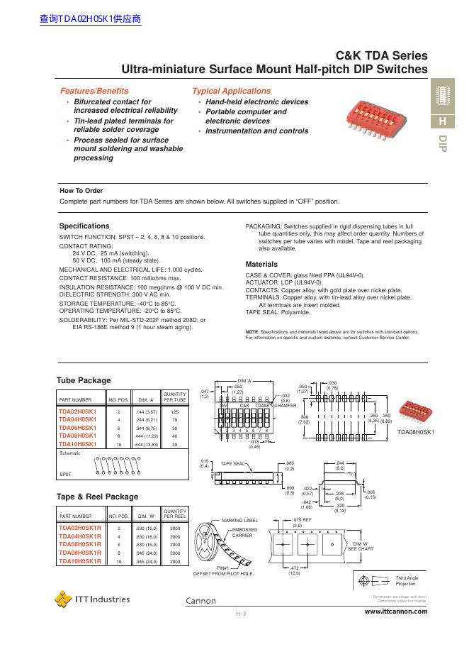 ITT industries C&K TDA Series Ultra-miniature Surface Mount Half-pitch DIP Switches 数据手册.pdf