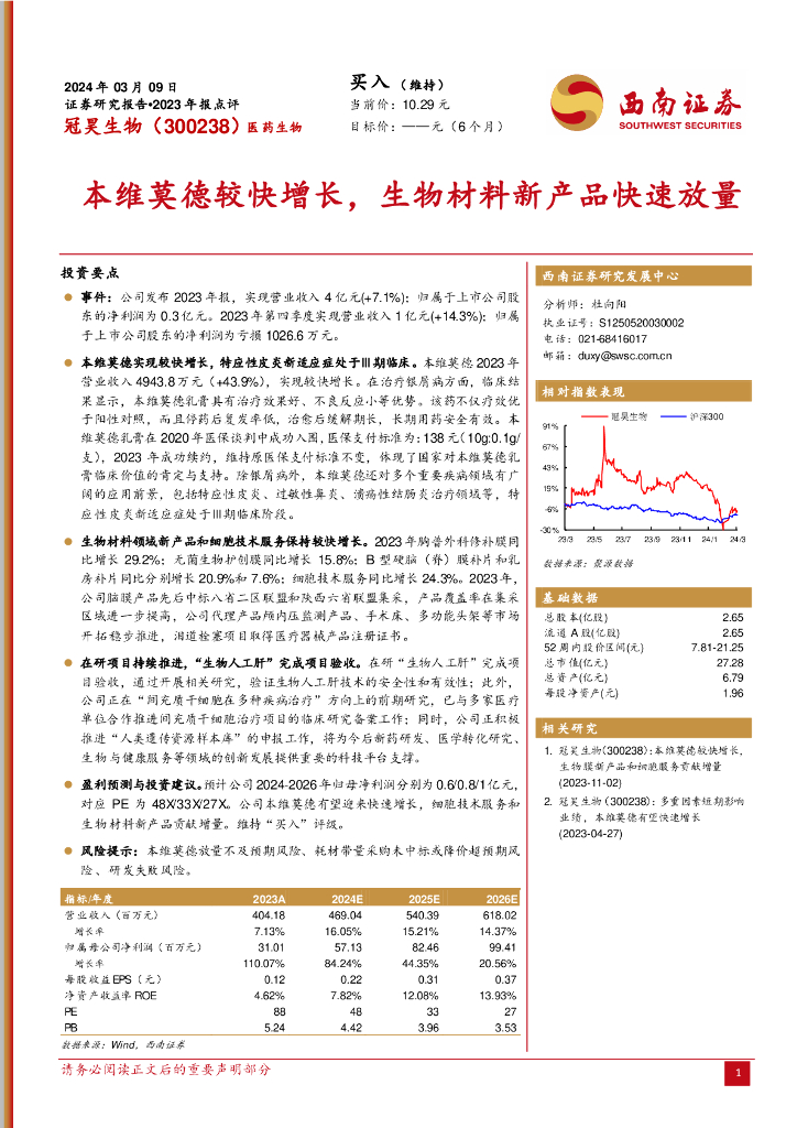 西南证券:冠昊生物(300238)-本维莫德较快增长,生物材料新产品快速放量.pdf