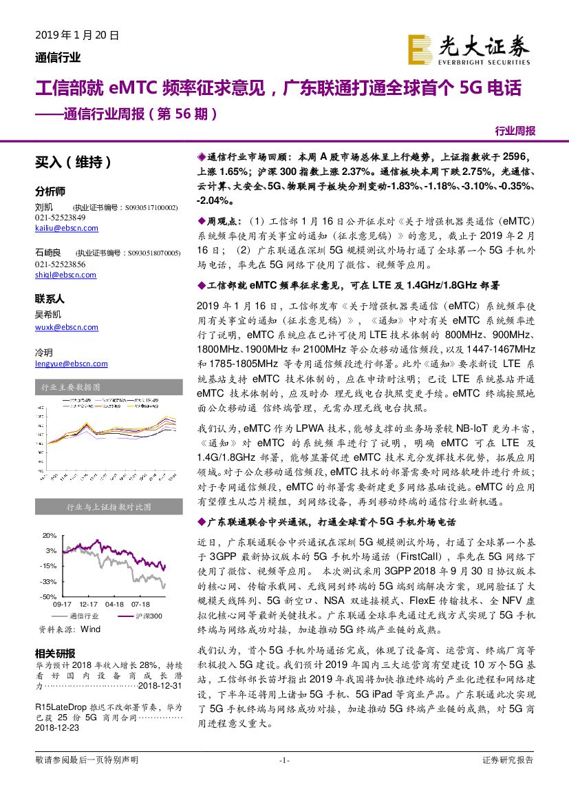 光大证券:通信行业周报(第56期):工信部就eMTC频率征求意见,广东联通打通全球首个5G电话.pdf