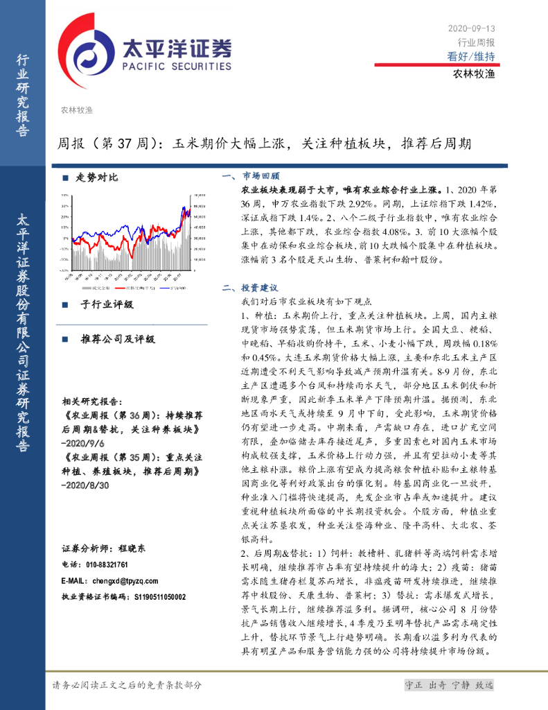 太平洋证券:农林牧渔周报(第37周):玉米期价大幅上涨,关注种植板块,推荐后周期.pdf