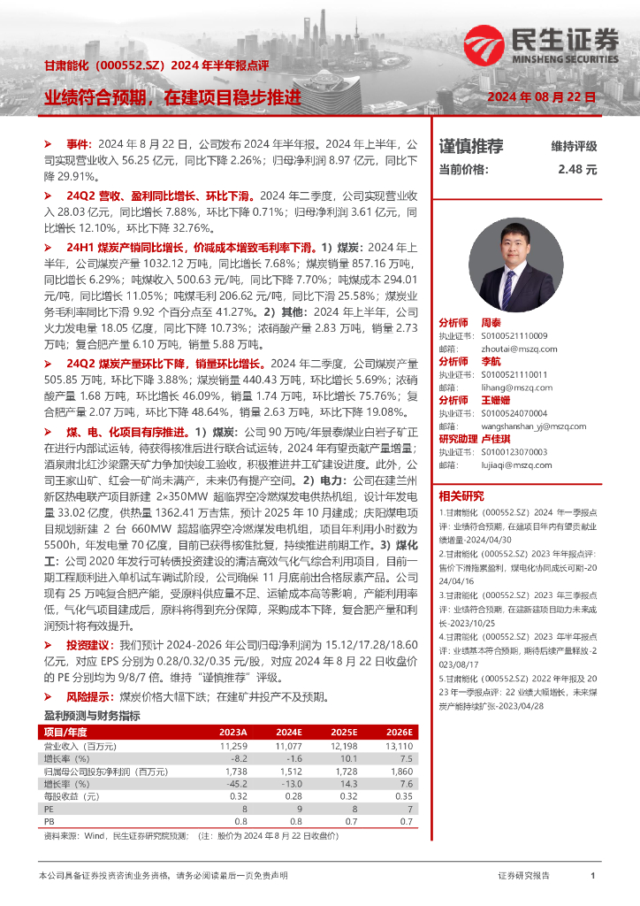 民生证券:甘肃能化(000552)-2024年半年报点评:业绩符合预期,在建项目稳步推进.pdf