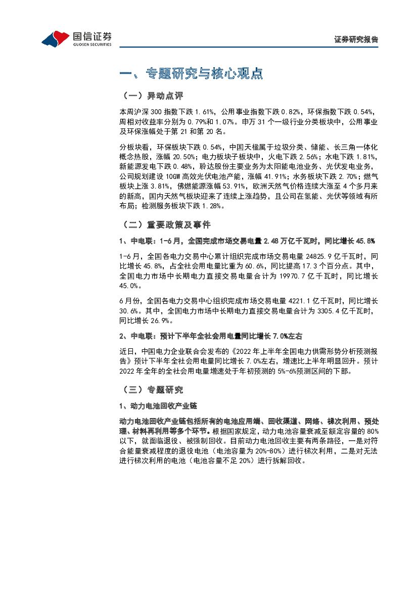 国信证券:环保与公用事业202207第4期:2022H1市场交易电量同比增长45.8%,动力电池回收市场将达千亿级.pdf