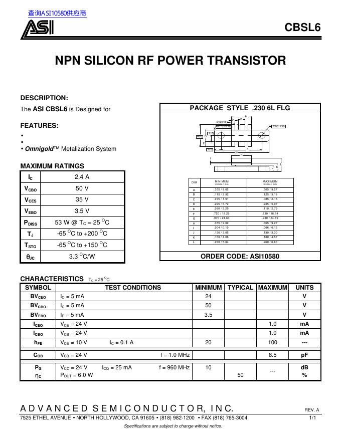 NPN SILICON RF POWER TRANSISTOR CBSL6 数据手册.pdf