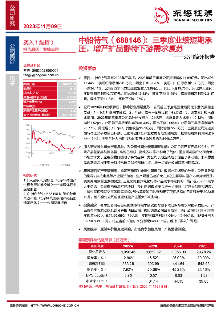 东海证券:中船特气(688146)-公司简评报告:三季度业绩短期承压,增产扩品静待下游需求复苏.pdf