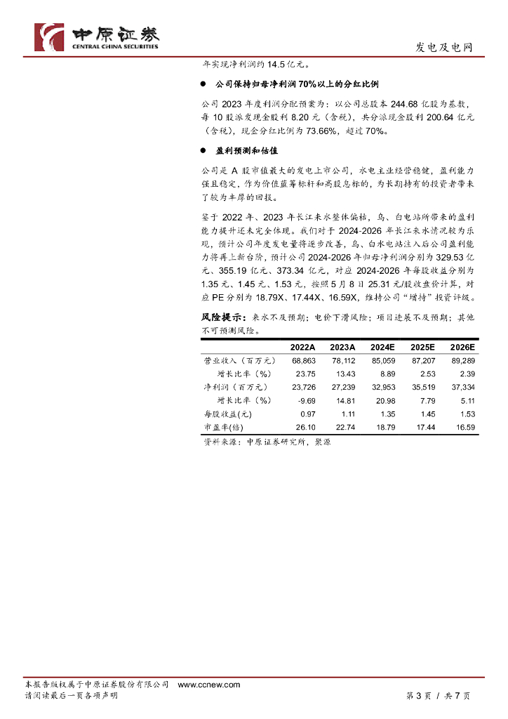 中原证券:长江电力(600900)-2023年年报及2024年一季报点评:乌白电站注入后,公司抗风险能力增强,盈利能力将逐步提升.pdf