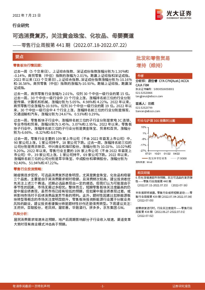 光大证券:零售行业周报第441期:可选消费复苏,关注黄金珠宝、化妆品、母婴赛道.pdf