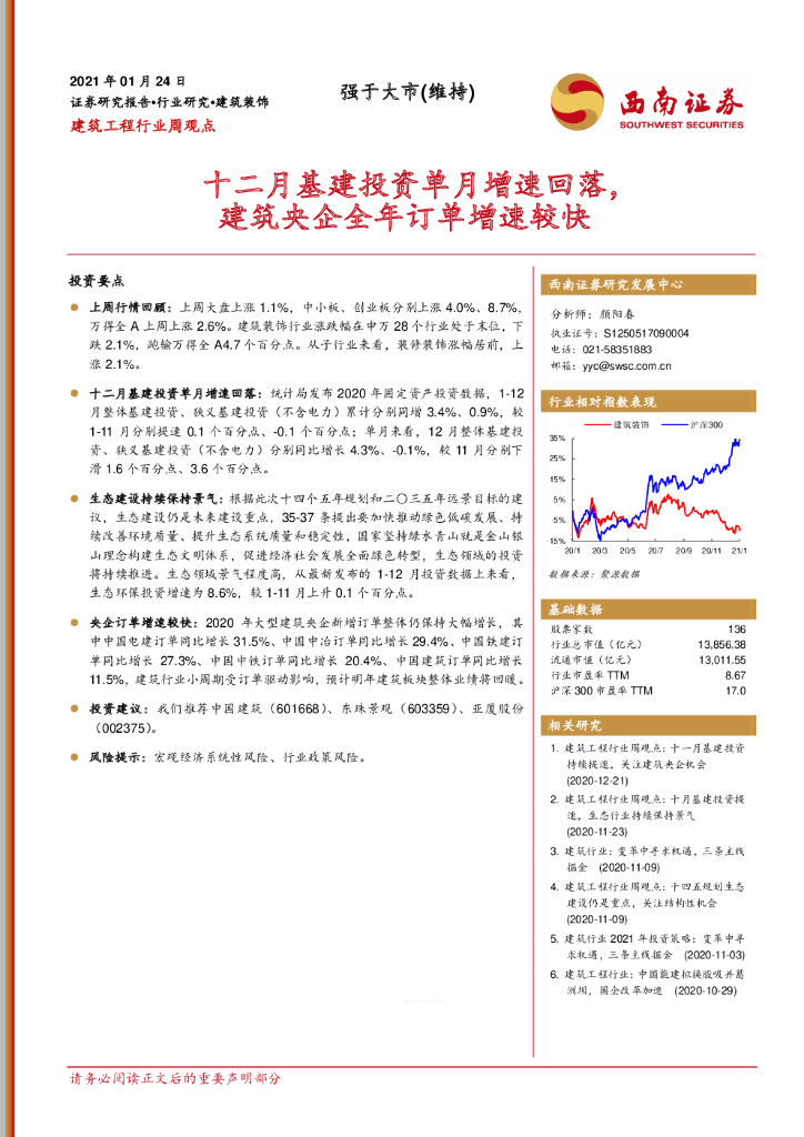 西南证券:建筑工程行业周观点:十二月基建投资单月增速回落,建筑央企全年订单增速较快.pdf