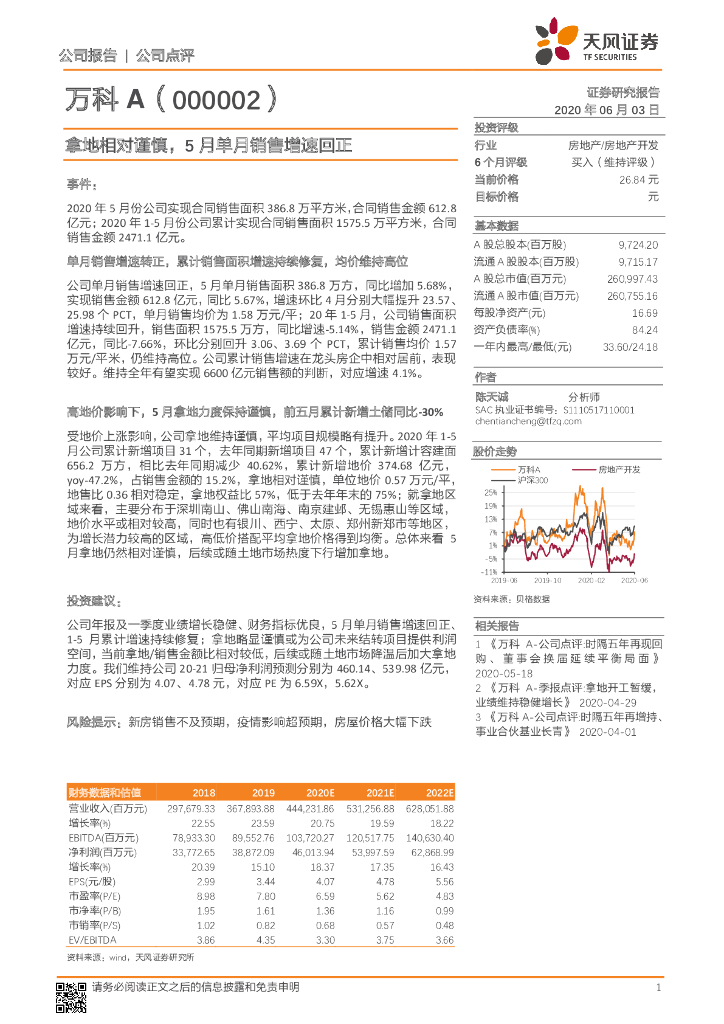 天风证券:万科A(000002)-拿地相对谨慎,5月单月销售增速回正.pdf