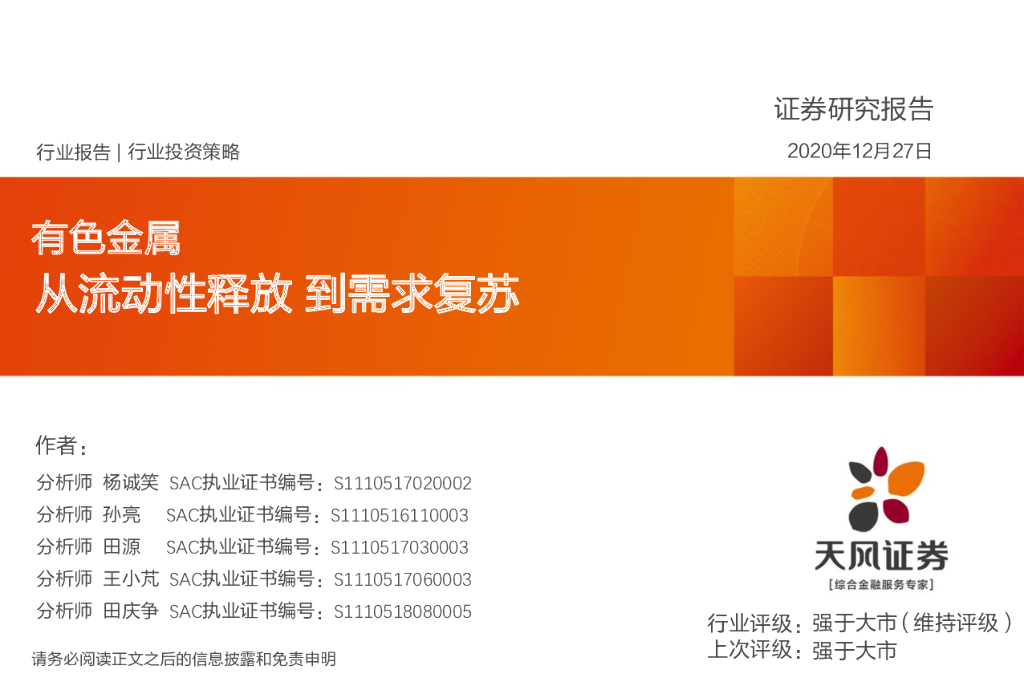 天风证券:有色金属行业投资策略:从流动性释放,到需求复苏.pdf