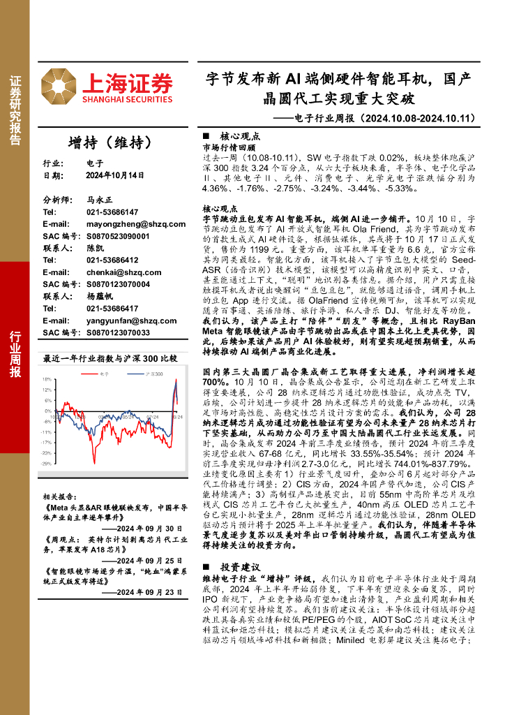 上海证券:电子行业周报:字节发布新AI端侧硬件智能耳机,国产晶圆代工实现重大突破.pdf