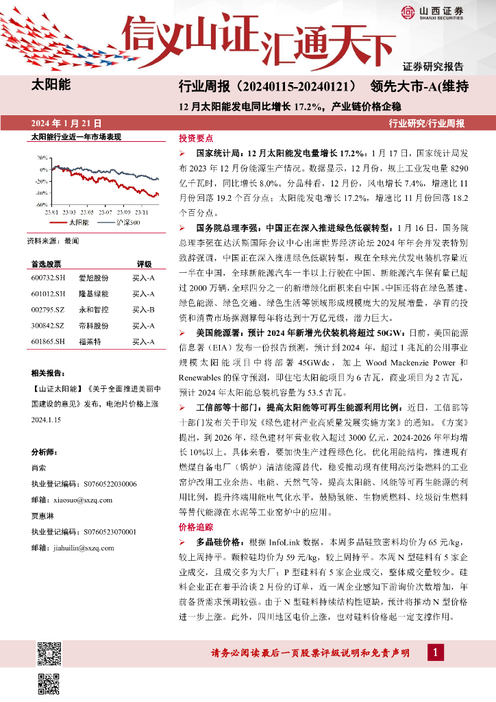 山西证券:太阳能行业周报:12月太阳能发电同比增长17.2%,产业链价格企稳.pdf