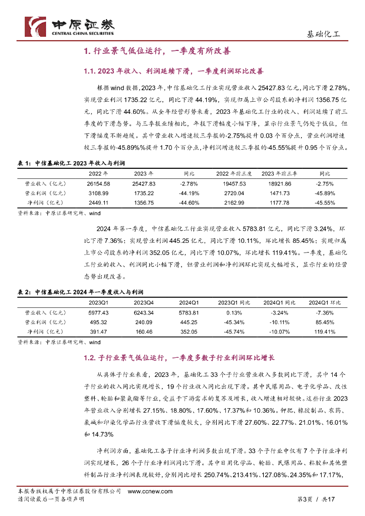 中原证券:基础化工行业深度分析:行业景气低位运行,一季度经营形势有所改善.pdf